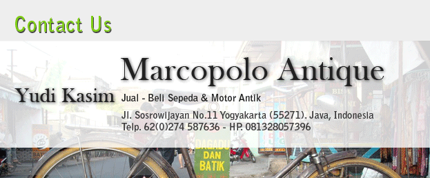 Bagi rekan-rekan pengemar dan kolektor serta semua yang mencintai sepeda kuno , antik , tua dan punya nilai sejarah , tentulah obsesi yang sangat didambakan adalah , memiliki sebuah sepeda tua yang cantik , original , langka , tua dan enak dinaiki , adalah mimpi setiap pencinta dan pemerhati sepeda tua , akan tetapi ada banyak kendala yang dihadapi untuk mewujudkan mimpi tersebut , ada kalanya sepeda yang dimiliki atau dikoleksi atau didapat dari peninggalan generasi sebelumnya sudah tidak original lagi , atau ada bagian yang harus diganti untuk keindahan , kenyamanan dan juga kebanggaan , sedangkan untuk mendapatkan bagian atau sparpart maupun kelengkapannya , seperti lampu , dynamo , bell , boncengan , standar dll sangat sulit untuk mendapatkanya , serta harga dan informasi lainnya yang dibutuhkan sangat sulit untuk memperolehnya , untuk itu kami MARCOPOLO ANTIK , dengan penuh kebahagian ingin membantukan kesulitan –kesulitan yang dihadapi para penggemar dan kolektor sepeda antik untuk memenuhi kebutuhan agar dapat mengkomplitkan sepeda kebanggaannya atau mengganti bagian sepedanya agar nyaman dinaiki ataupun ingin mengoriginalkan sepedanya.